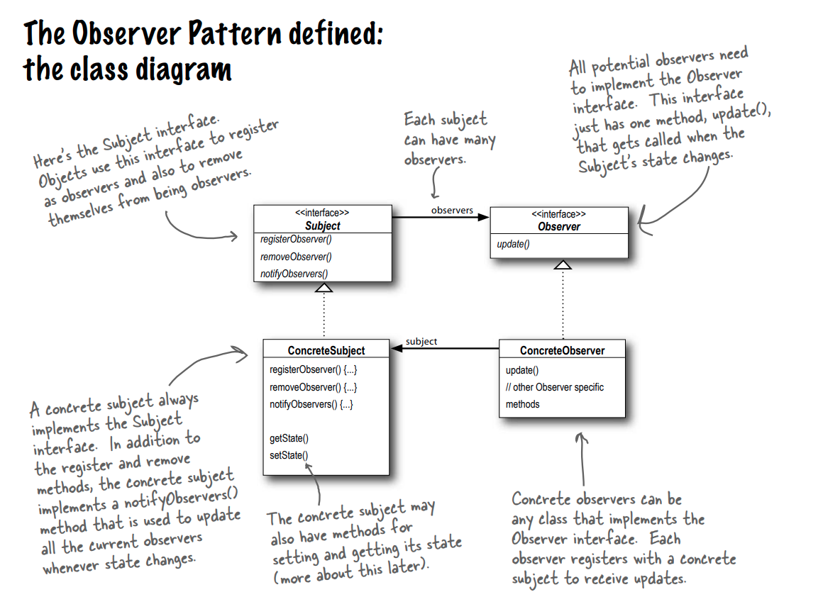 - The only thing the subject knows about an observer is that it implements a certain interface (the Observer interface). It doesn’t need to know the concrete class of the observer, what it does, or anything else about it.